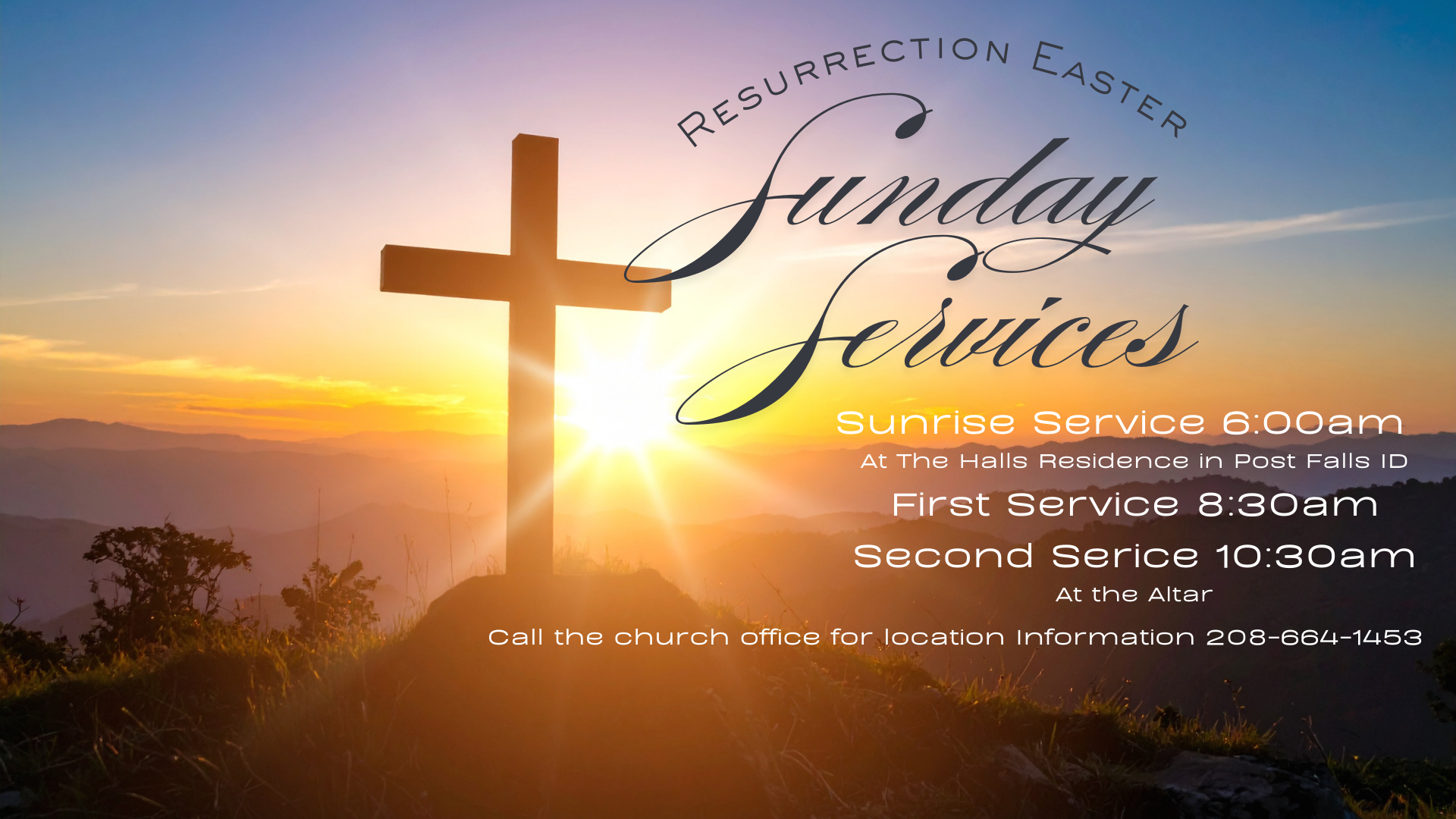 Join for Services on Resurrection Easter Sunday. We will hold our usual 8:30am and 10:30am Service here at the Altar. In addition, we have a Sunrise Service that will begin at 6am on Sunday, April 5th at The Hall's residence in Post falls ID. Coffee and light refreshments will be available. Please call the Church office for directions & location information.